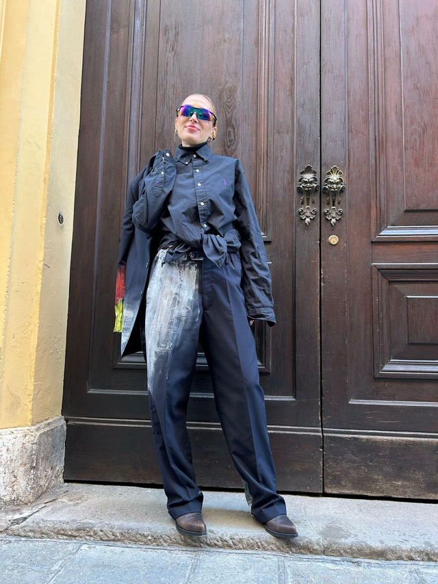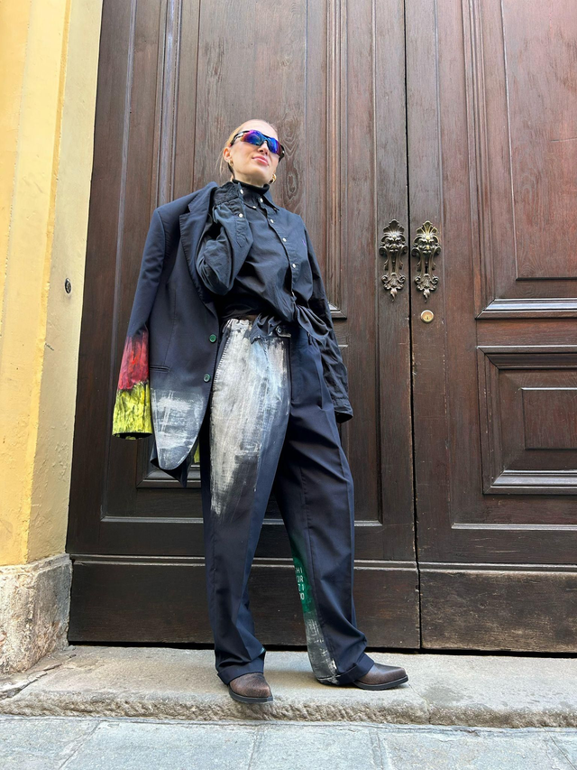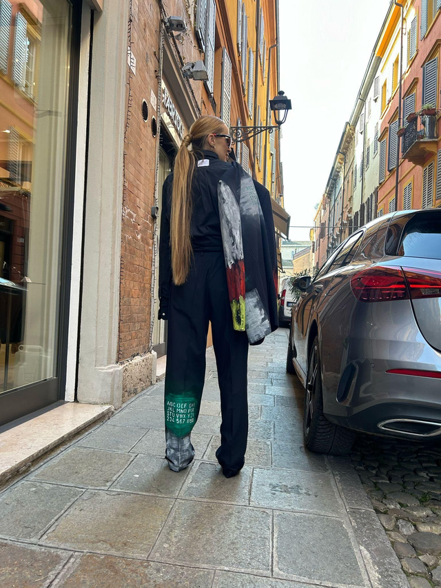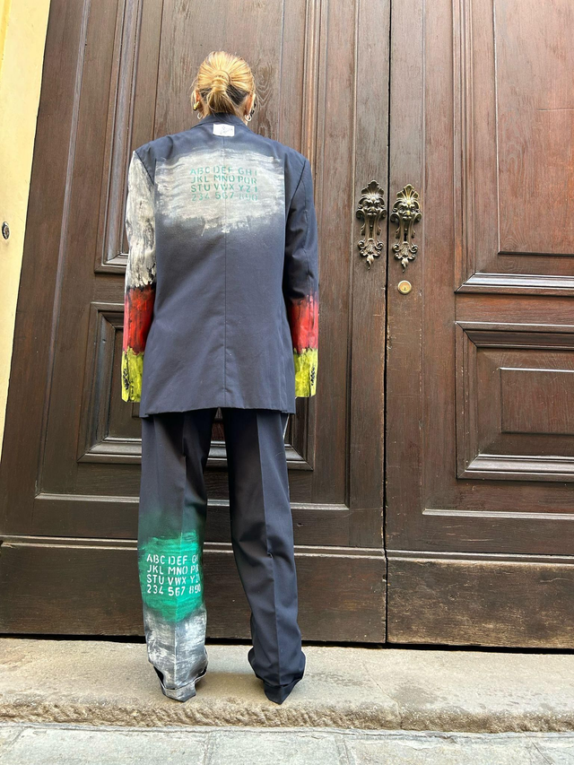 Reworked elegant pants with print. Made by hand. Fit over, made with fine off stock pants, realised with up cycling techniques, sartorial process. Unique piece, 100% fine wool. Size M/L
