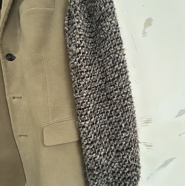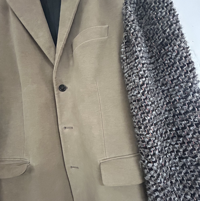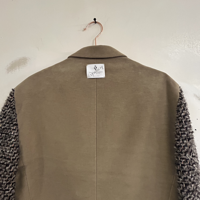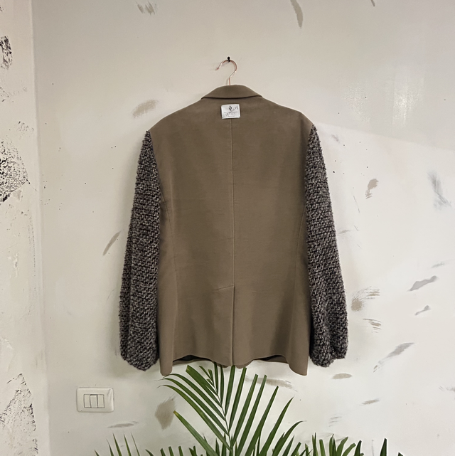 Reworked giacca elegante con maniche di maglia. Realizzato con tecnica di upcycling nel nostro laboratorio, remade in Italy