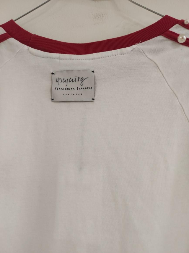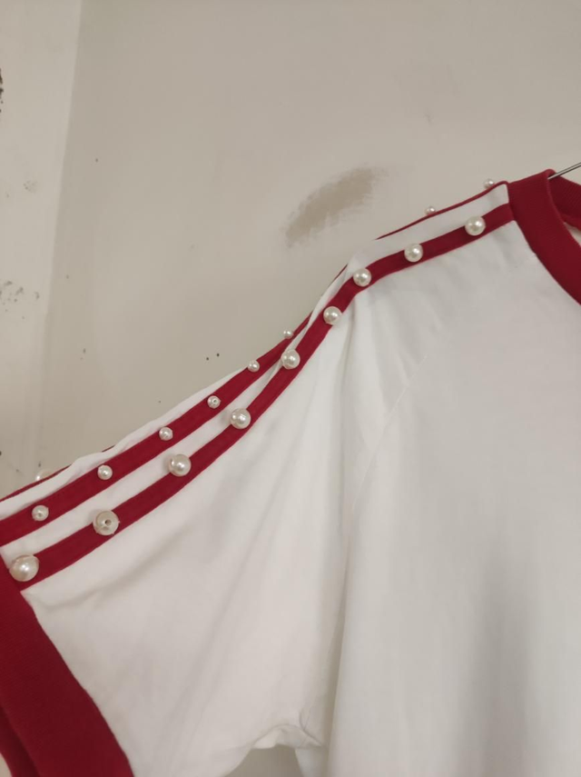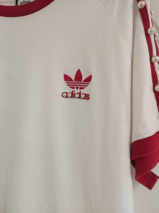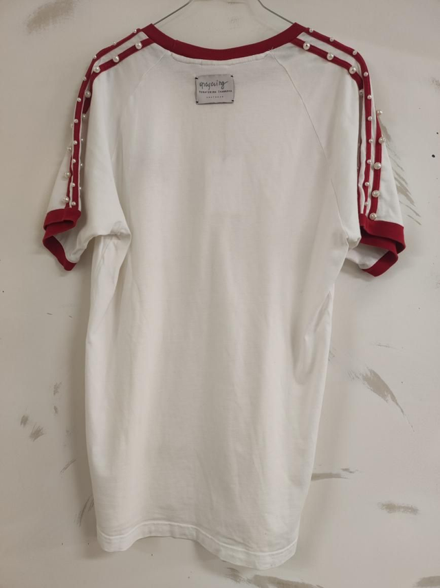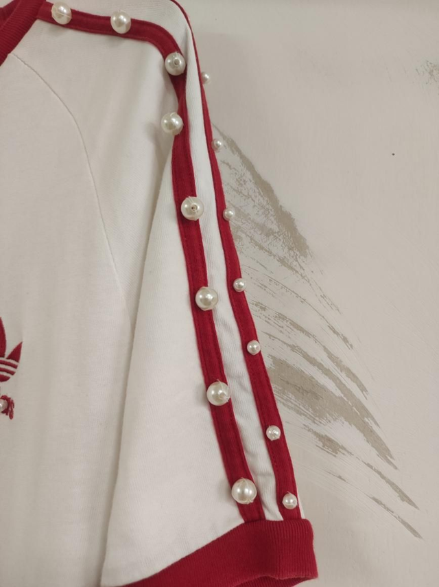 Reworked t -shirt with perl. The pearls are hand sewn. Made with dead stock Adidas t -shirt. Realized with up cycling techniques, sartorial process. Unique piece. Size L regular fit